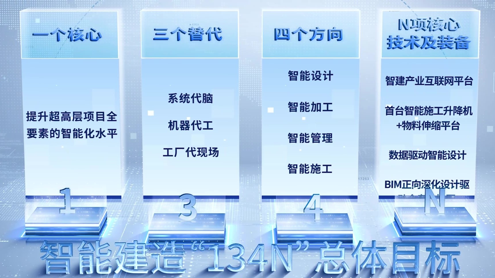 該項目代建過程中,以“系統代腦”“機器代工”“工廠代現場”為總牽引,以“134N”智能建造體系為核心,即1個智能化核心 、3大替代、4大階段、N項技術創新,在工程設計-生產-施工-運維4大階段,用“3大替代”實現全鏈條智能化建造,運用多項技術核心技術及裝備,在多個技術革新方面走在行業前列。