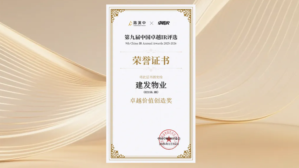 在第九屆中國卓越IR評選中,建發房產旗下建發國際集團(01908.HK)與建發物業(02156.HK)憑借在投資者關系管理領域的良好表現,分獲“卓越資本市場溝通獎”與“卓越價值創造獎”;