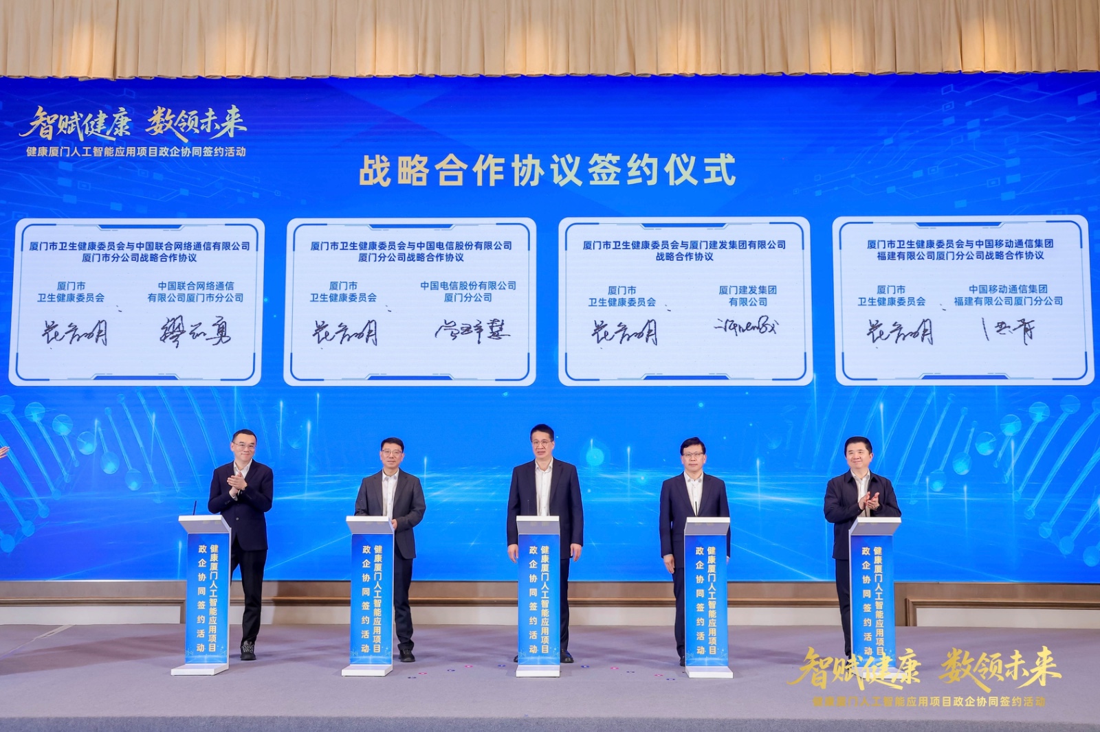 在簽約環節,市衛健委黨組書記、主任花育明,建發集團黨委書記、董事長許曉曦,中國電信廈門分公司黨委書記、總經理曾群慧,中國移動廈門分公司黨委書記、總經理洪青,中國聯通廈門分公司黨委書記、總經理繆志勇共同上臺簽署政企協同戰略合作協議。“藥耗追溯智慧監管(一碼通)平臺”、“區域影像云一體化服務平臺”、“醫院智慧后勤一體化服務平臺”三大人工智能應用項目同步上線啟動。