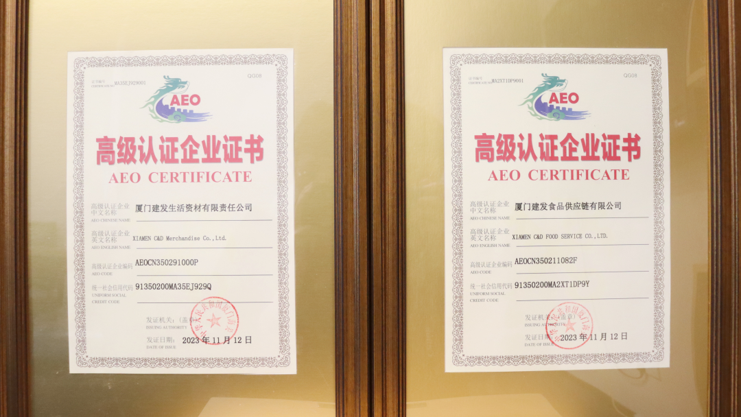 Recently, Xiamen C&D Merchandise Co., Ltd., Xiamen C&D Food Supply Chain Co., Ltd., and Heilongjiang Sandu International Trading Co., Ltd., a joint venture under C&D Paper & Pulp Group, were awarded the Authorized Economic Operator (AEO) status by customs.