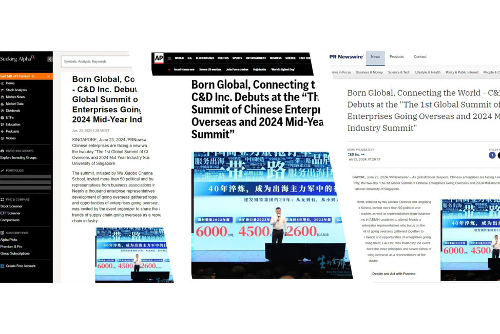 Recently, the inaugural Global Go-Global Summit and the 2024 Mid-Year Industry Forum were held at the National University of Singapore. As a representative enterprise of Xiamen’s supply chain going global, C&D Co., Ltd. shared relevant experiences at the meeting. Hundreds of media platforms, including XMTV, Singapore’s news portal AsiaOne, the Associated Press in the United States, financial analysis platform Seeking Alpha, and Yahoo, have widely covered and republished the related reports.